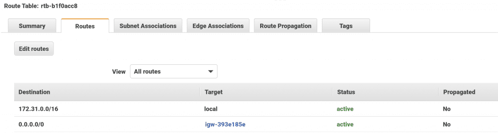 Here we can see that any traffic destined for inside the VPC has a target of local. Any external traffic has a target of our default internet gateway, allowing traffic out to the internet.