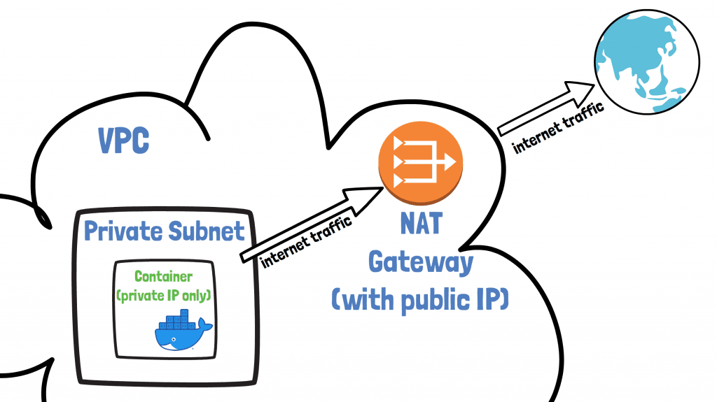 The AWS NAT Gateway is AWS's answer to giving a container internet access without having to assign it a public IP. It's like the internet gateway for private subnets.