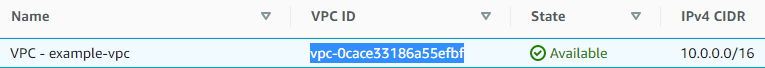 You can go view the VPC details in Services > VPC > Your VPCs. Look for a VPC called VPC - example-vpc and copy the VPC ID.