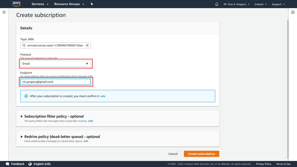 On the Create subscription page you need to select Email from the Protocol drop down list. Type your email address into the Endpoint field, then select Create subscription at the bottom: