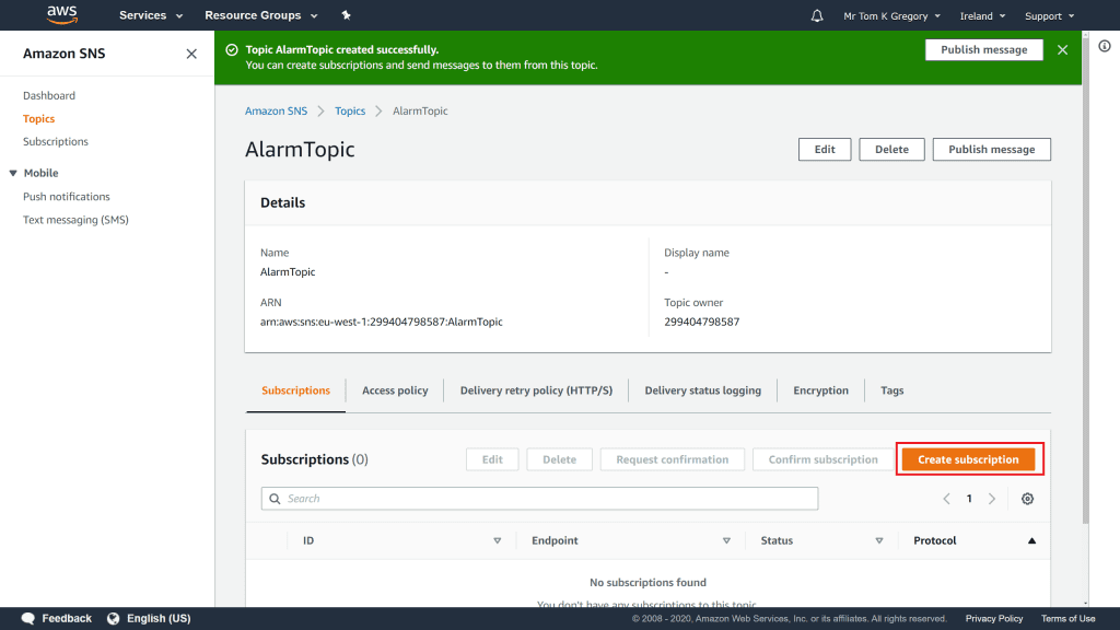 Now that we have a topic, let's subscribe an email address to it. On the topic details page, select Create subscription: