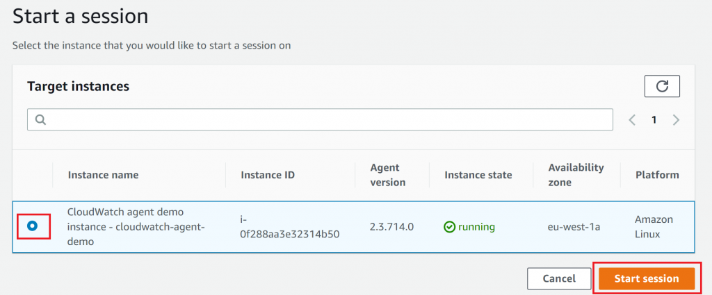 Now we can select the instance to connect to. Select the CloudWatch agent demo instance, then click Start session: