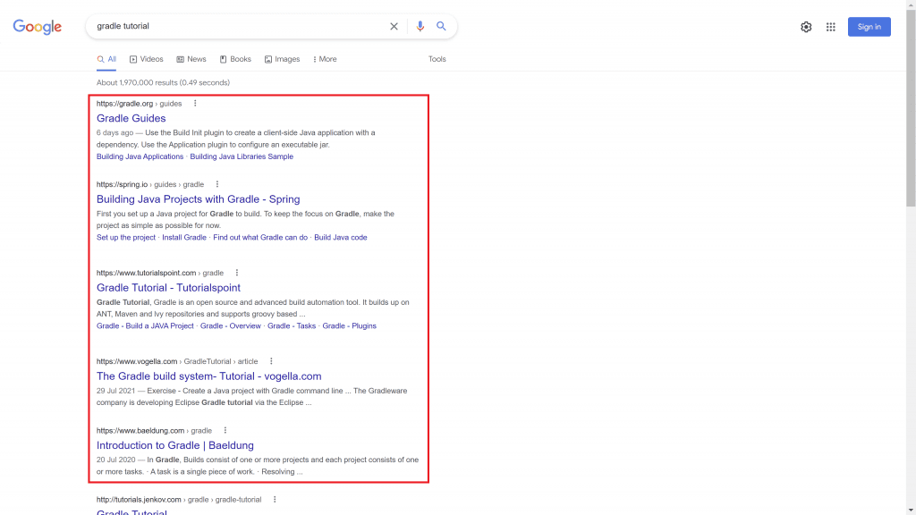 Google Gradle tutorial results (Videos and People also ask sections were removed)