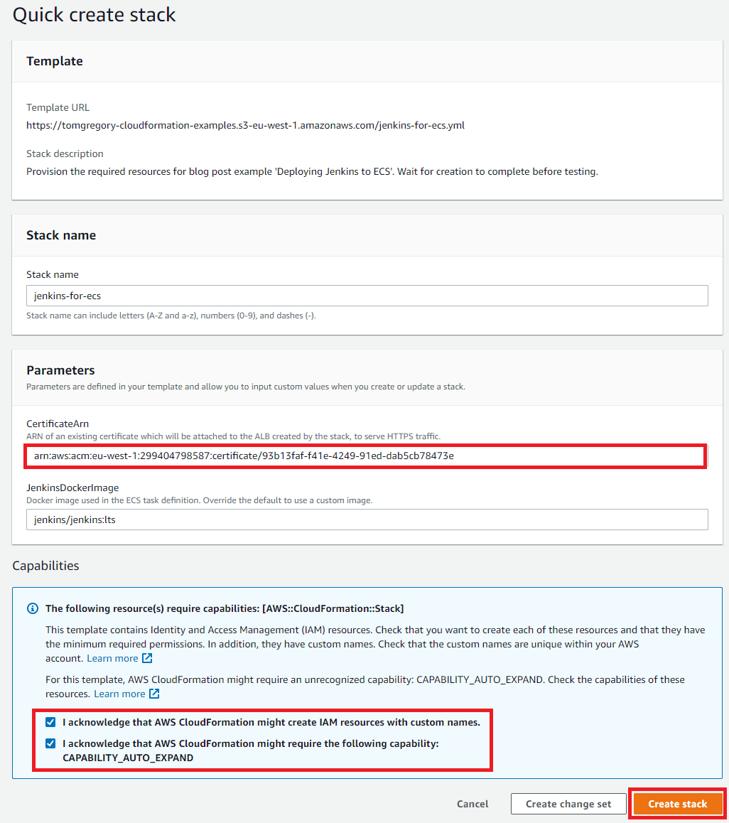 This main stack (jenkins-for-ecs.yml) references the nested stack created above, then it defines all the ECS resources required to get a Jenkins ECS service running, and hooks it into a load balancer.