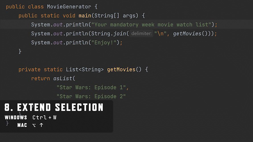 | 8. Extend selection | Ctrl + W | ⌥ ↑ |