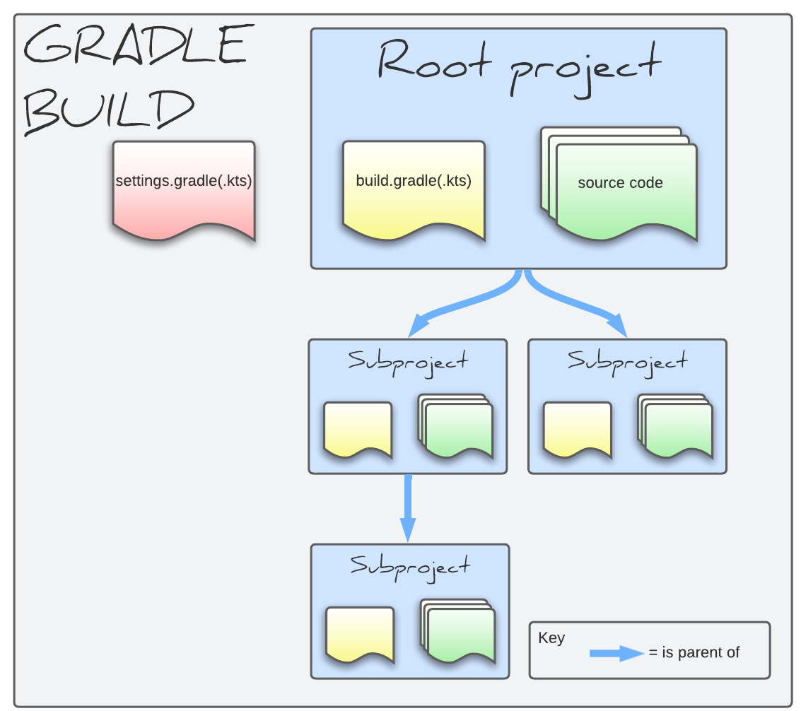 build.gradle(.kts) and source code representing the root project, which is equivalent to the project contained in a single-project build
