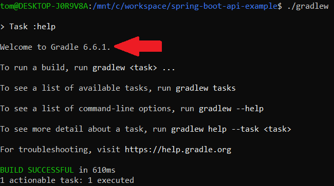 The output here is similar to what we had when we ran gradle. You can see that the version is different though, 6.6.1 vs. 6.8.2. That may or may not be important, but using gradlew avoids us having to think about any inconsistencies and we can be sure that all team members or CI servers are using the same Gradle version to build the project.