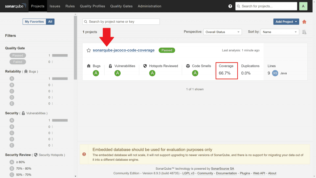 We can head back to SonarQube at localhost:9000/projects to see the test code coverage report.