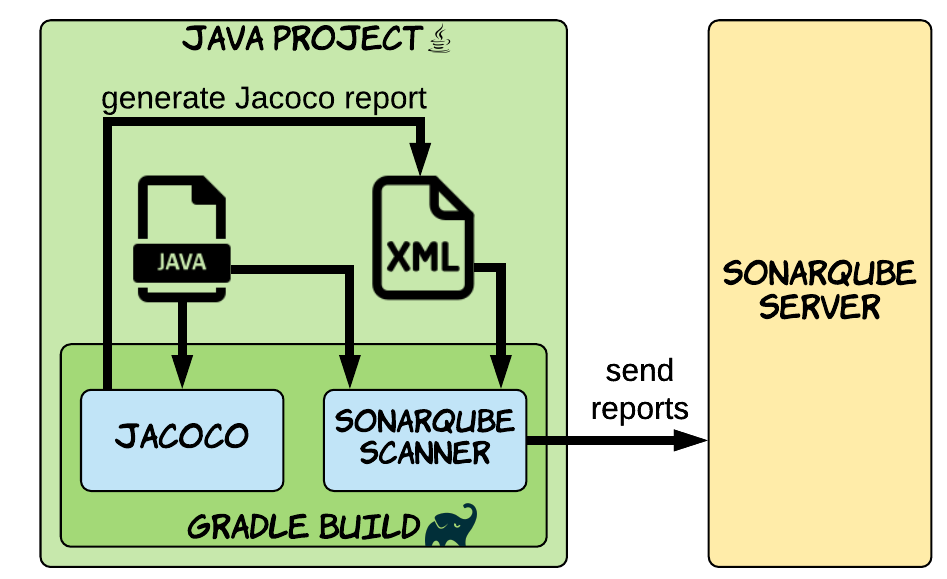 Thankfully a big piece of the puzzle is already solved for us simply by including the java and jacoco plugins. With this plugin combo Gradle automatically enriches any task of type Test to also produce Jacoco code coverage execution data.
