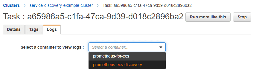 Navigate to the Prometheus task as before, then select the Logs tab. Here you are given a drop down to select the container you want to see the logs from: