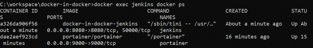 Now let's issue a Docker command to Jenkins using docker exec jenkins docker ps: