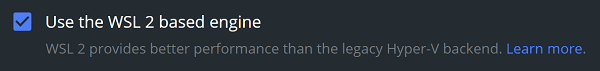 The WSL 2 engine is now the default for Docker for Windows, but this can be changed within the Docker for Windows settings.