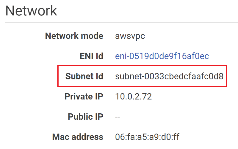 If you view the task details, you can see the Subnet Id which you can verify belongs to the Jenkins agent VPC (i.e. the VPC with name containing JenkinsAgentVPCStack). Importantly, that means the agent is running in a different VPC to the master.