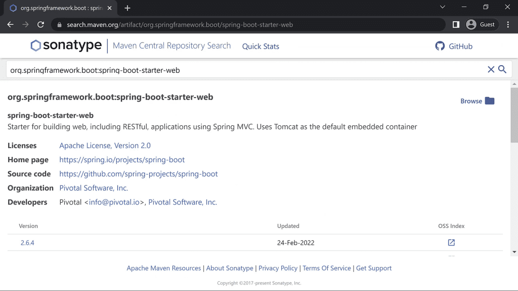 For example, here's how the URL looks for the Apache commons-lang3 artifact within the Maven Central repository.