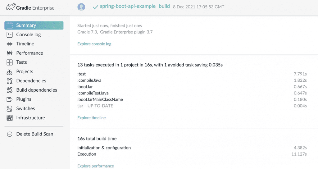 This browser based report contains a build summary, a detailed account of your build's performance, a full dependency report, and much more.