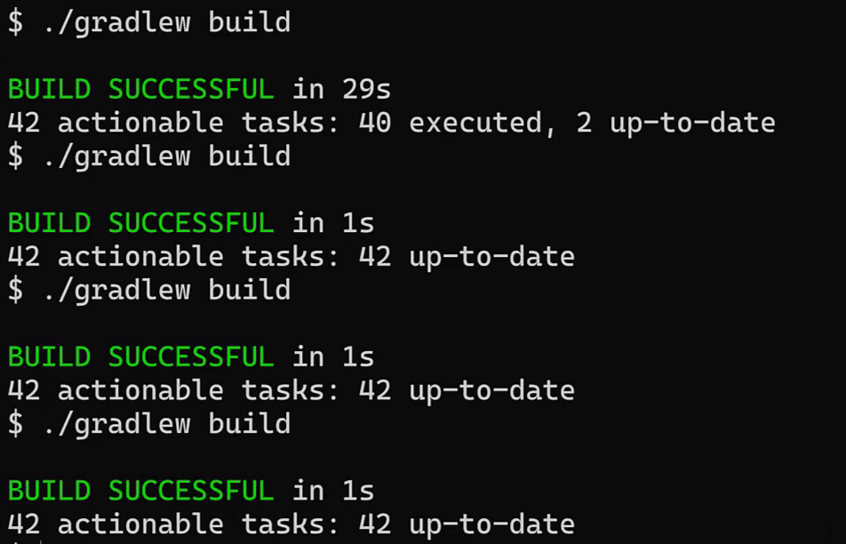 Moving onto Gradle, we'll run ./gradlew build. It compiles the code and runs the tests. I'll run it 3 more times, which gives an average of 1 second.