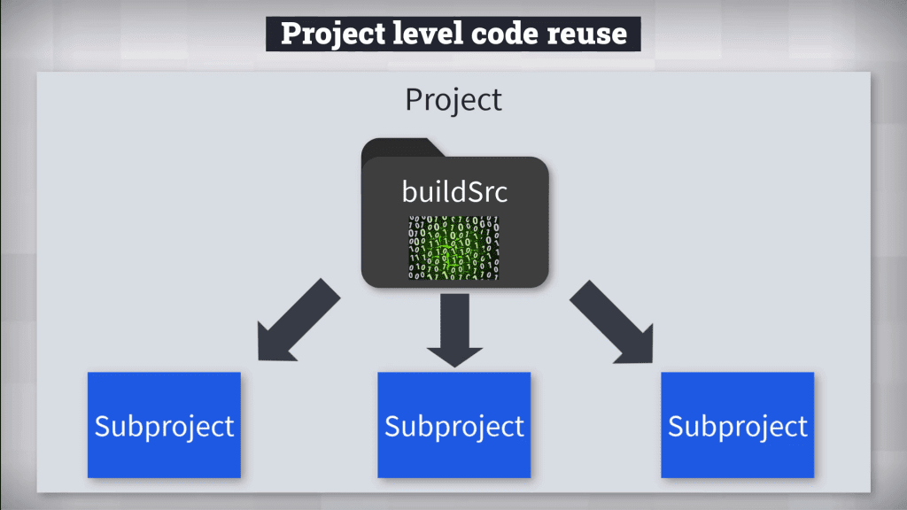 In Gradle we can extract the class into a special project directory called buildSrc. This is the 2nd level of reuse. Any code you put in buildSrc is available to the build.gradle file of other subprojects.