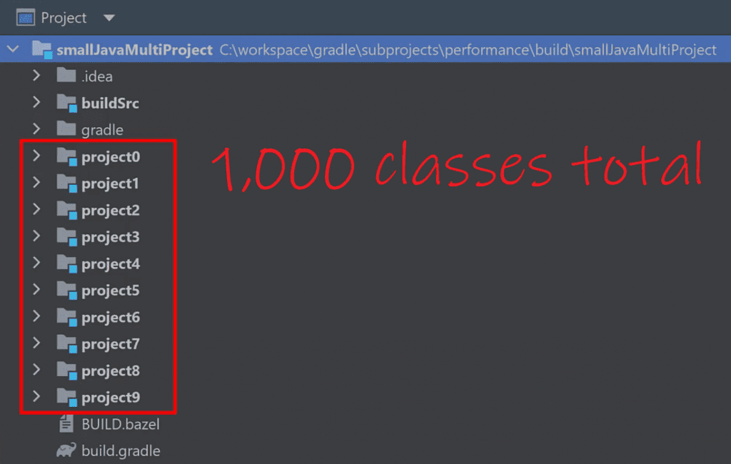 Let's be specific about what faster means, by comparing Maven and Gradle's performance in a real project. This small Java project has 10 sub-modules, each with 50 main classes and 50 test classes. 1,000 classes in total.