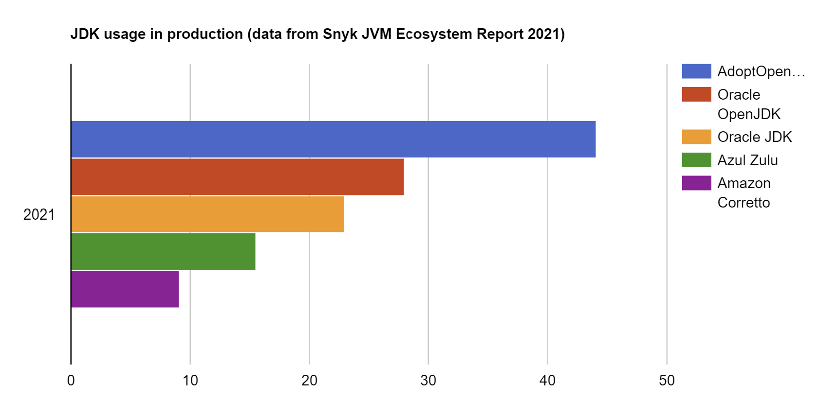 According to the JVM Ecosystem Report 2021, the most popular 3rd party JDKs used in production in 2021 were: